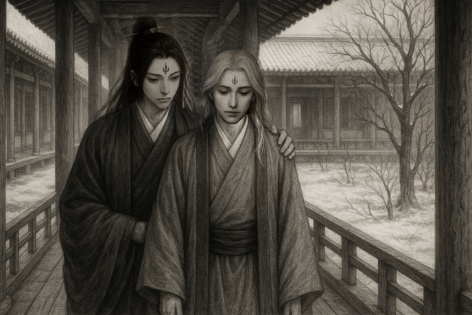 しっかりとうなずき返す犀星に、玲陽は口元を緩めた。一瞬目を彷徨わせ、それから、そっと犀星の唇に指を一本押し当てた。