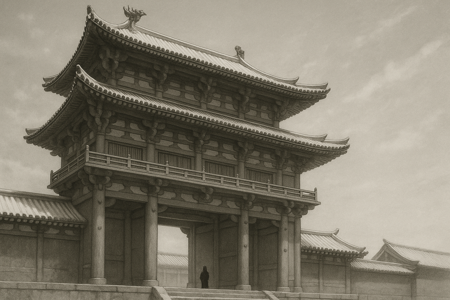 左右に三重の楼閣をそなえた構造で、最上階には朱塗りの手すりがついた回廊がある。見張りの兵が何人か、弓を手に立っていた。それを支える基部は堅牢な石造の台座で、階段が前後にせり出し、その両側には石獅子が堂々とした風体で鎮座していた。城門の幅は、馬車が五台は並んで通っても余裕があるほどだ。