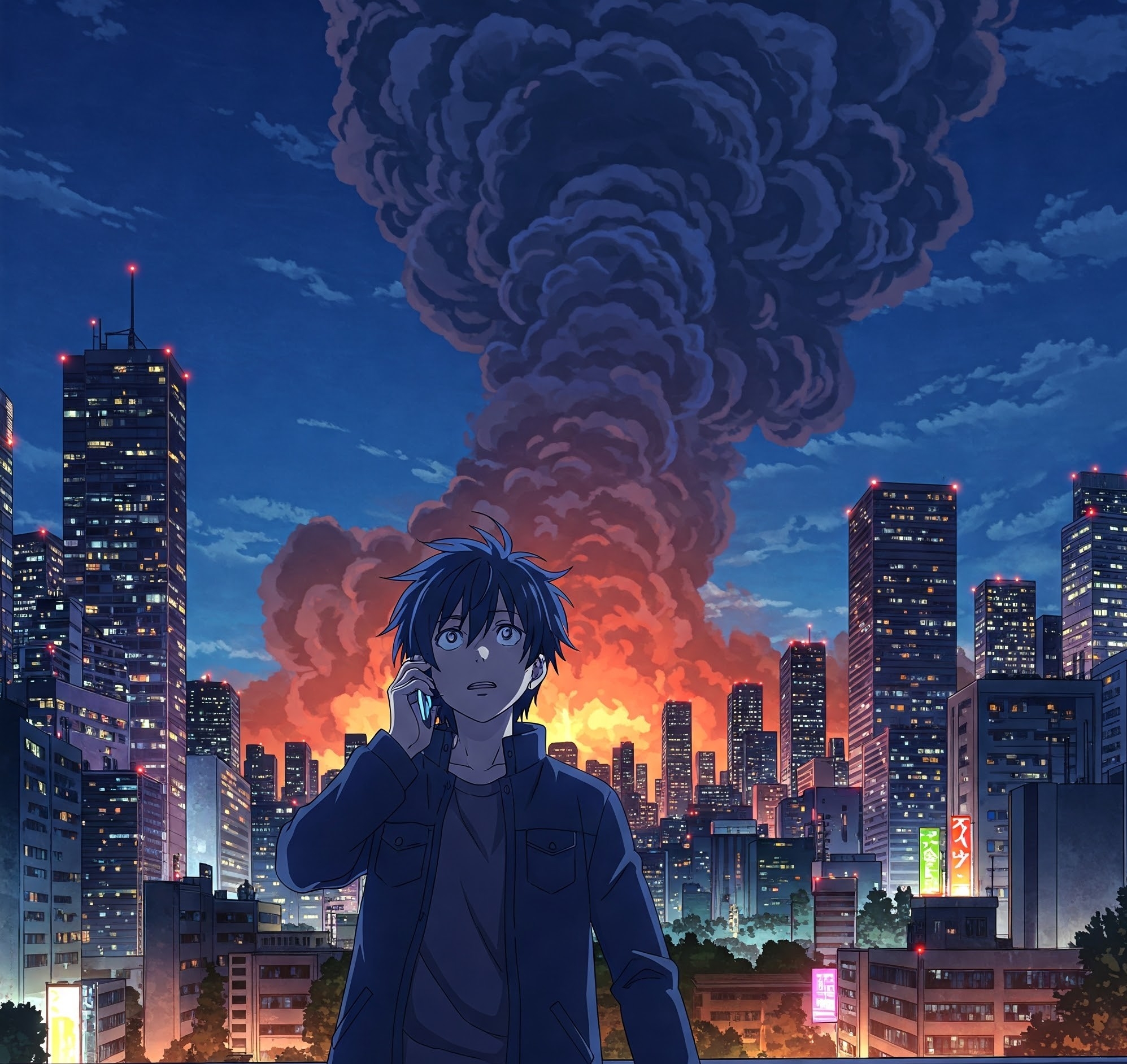 その言葉を遮るように轟音が轟いた。視線を回すと、音源ははるか向こう。ビル群の陰に隠れた場所で爆煙が空に上がっていくのが見えた。夜に浮かんだ汚らしい爆煙は、月夜に向かって伸びていく。