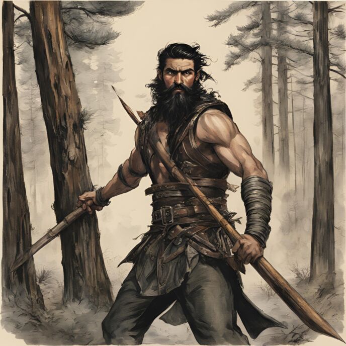 筋肉をひけらかすように前のボタンを外した革製のベストとズボンのみの服装、長い長い木製の槍を携えた厳つい男が立っている。