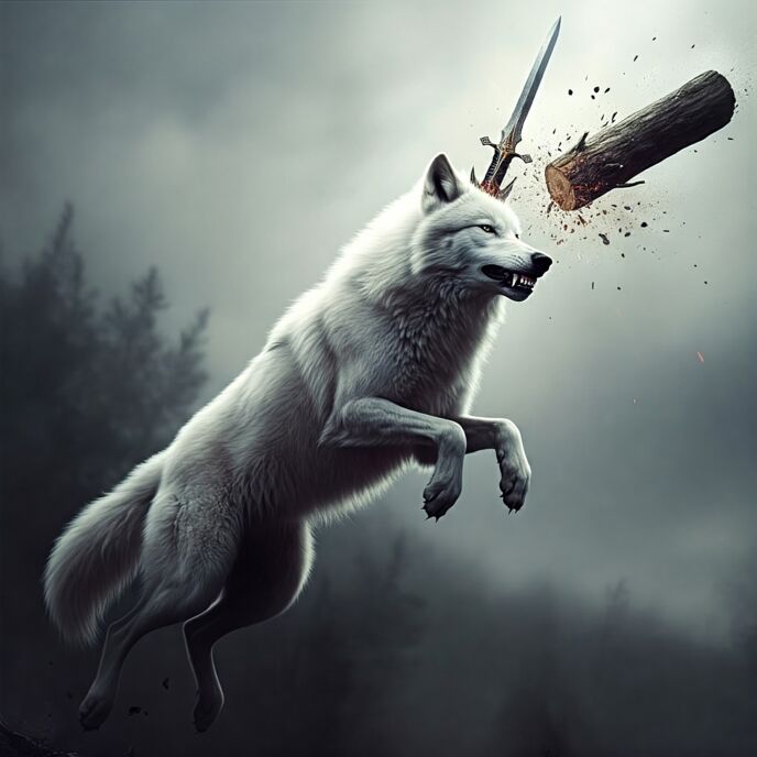 そこに現れたのは、額に大きな剣を生やした巨大な白い狼だった。狼はその剣を使い、丸太を縦に切り捨てる。