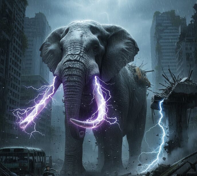 男は息を呑んだ。象の顔面から左右に伸びる、5メートルを超える二本の巨大な牙は、紫色の雷を纏っていた。