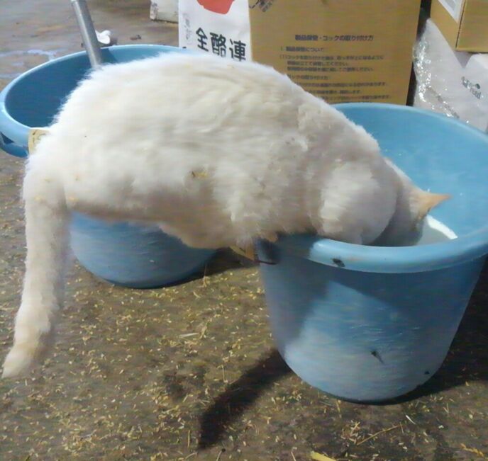 牛舎で飼っている猫たちが集まってきて、子牛が飲み残したバケツに乗って牛乳争奪戦を繰り広げる。