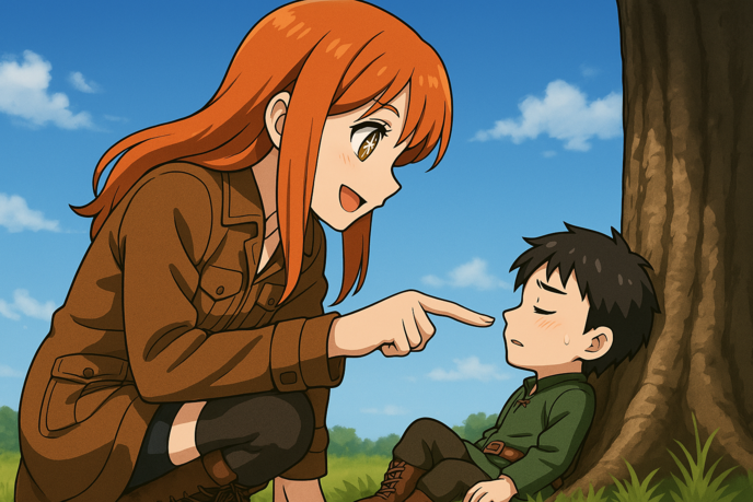 オレンジ色のストレートヘアが肩までまっすぐ伸び、陽光を受けてふわりと揺れる。その髪には野花を編み込んだ素朴な飾りがさりげなく留められており、ぱっちりとした瞳と少し丸みを帯びた頬が、彼女の人懐っこくも飾らない魅力を際立たせている。