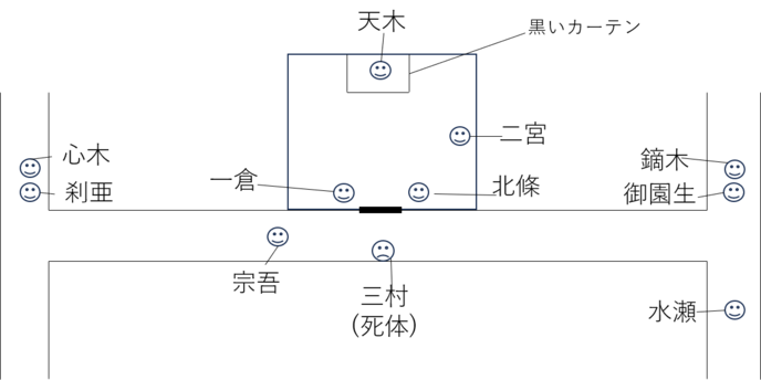 「うーんそうだなあ。意見を言う前に、君が彼の死体を発見する直前の皆の位置関係をまとめてみようか」