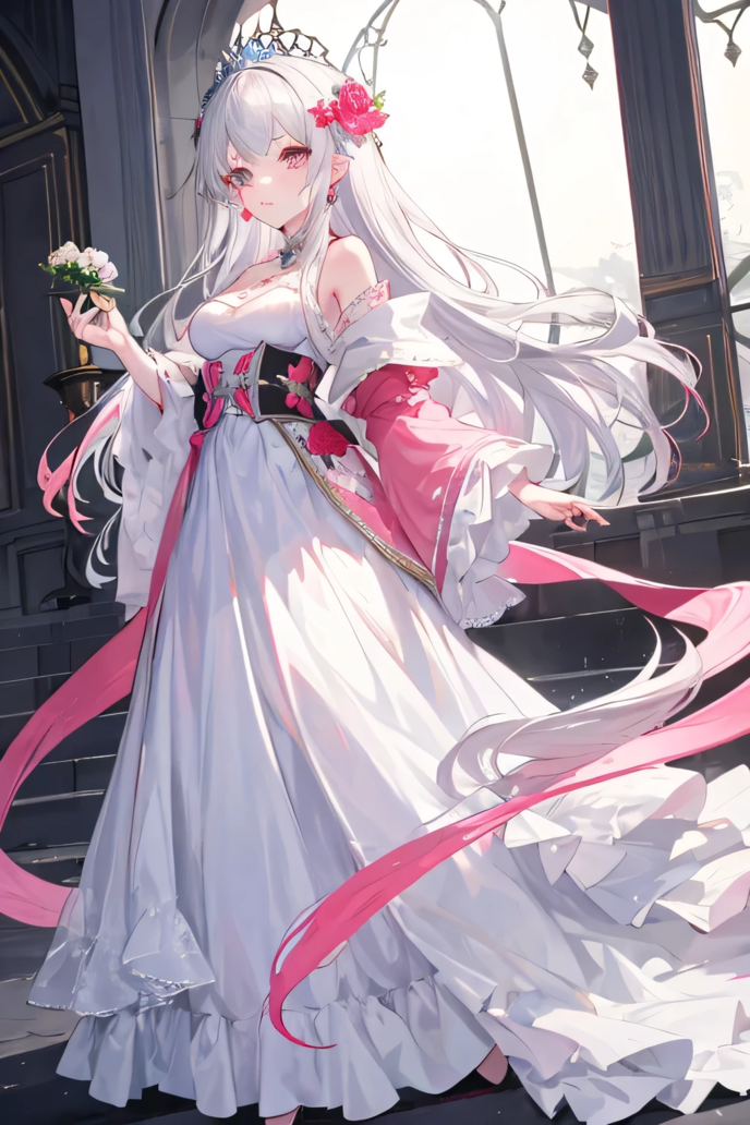 清楚さと華麗さを両立させた美しいドレスを着た、銀髪にピンクの髪が混ざった不思議な髪色を持つ美しい少女。