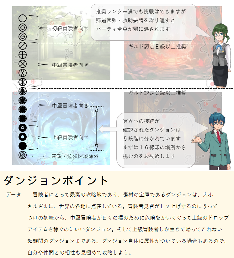 ダンジョンは冒険者による討伐によってモンスターが発生しなくなり、閉鎖・もしくは危険区域を除外されることがある。また、新たなダンジョンの発見についても、冒険者ギルドによって随時情報更新されている。その一方、発見されたばかりのダンジョンの付近では、宿屋や薬屋をはじめ諸施設や町がまだなされていない場合が多い。瀕死の状態でなんとかダンジョンを出られたとしても、助かる可能性が極めて低いので注意だ。事前の準備をしっかりと行うためにも出発前には必ず冒険者ギルドに寄って、最新の周辺環境を確認することが肝要だ。