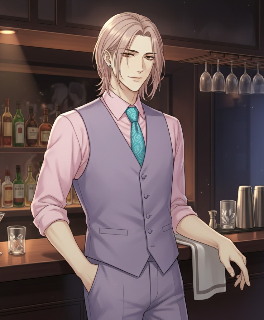 入り口の扉を開けた常連客を出迎えたのは、見慣れた店主たちではなく、見目麗しい「新人」だった。淡い紫色のベストにボトムス。ベビーピンクのドレスシャツに極めつけは、ティファニーブルーの柄物ネクタイをきっちりと締めたセイルだ。