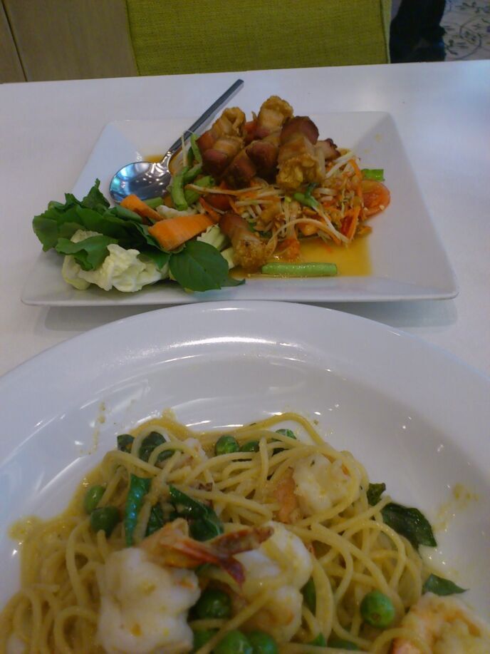 豚バラ入りのソムタムとココナッツミルクソースのスパゲッティ。