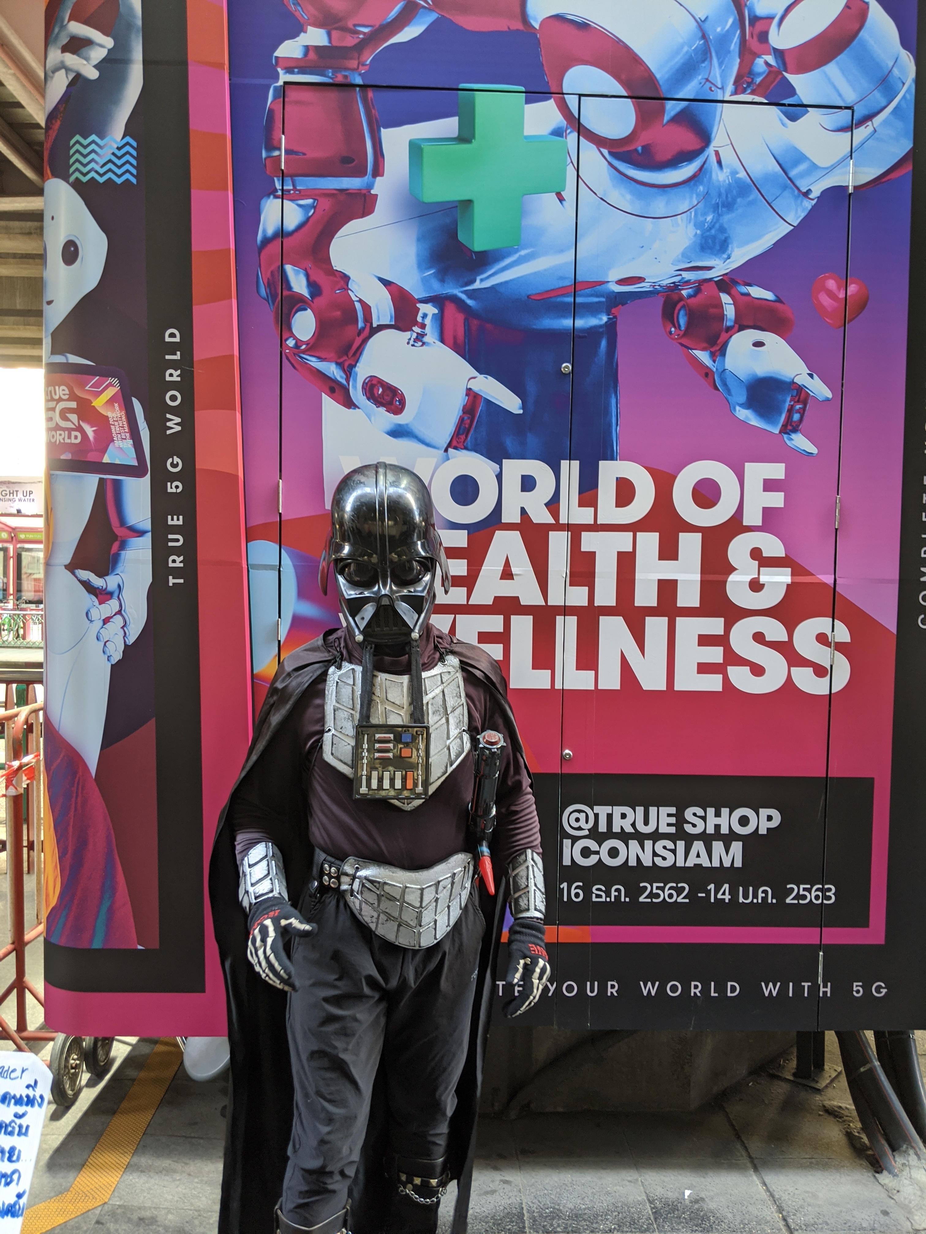足下に置かれた段ボール紙にはタイ語で「彼女が子宮筋腫です、お金が無くて手術ができません」的なことが書いてあった。募金をしてくれた人と2ショットを撮るって感じだったけど、正月の冬であってもバンコクは30℃だからね。そんなところでマスクを付けてマントも着てダースベイダーのコスプレをしていたんだ。