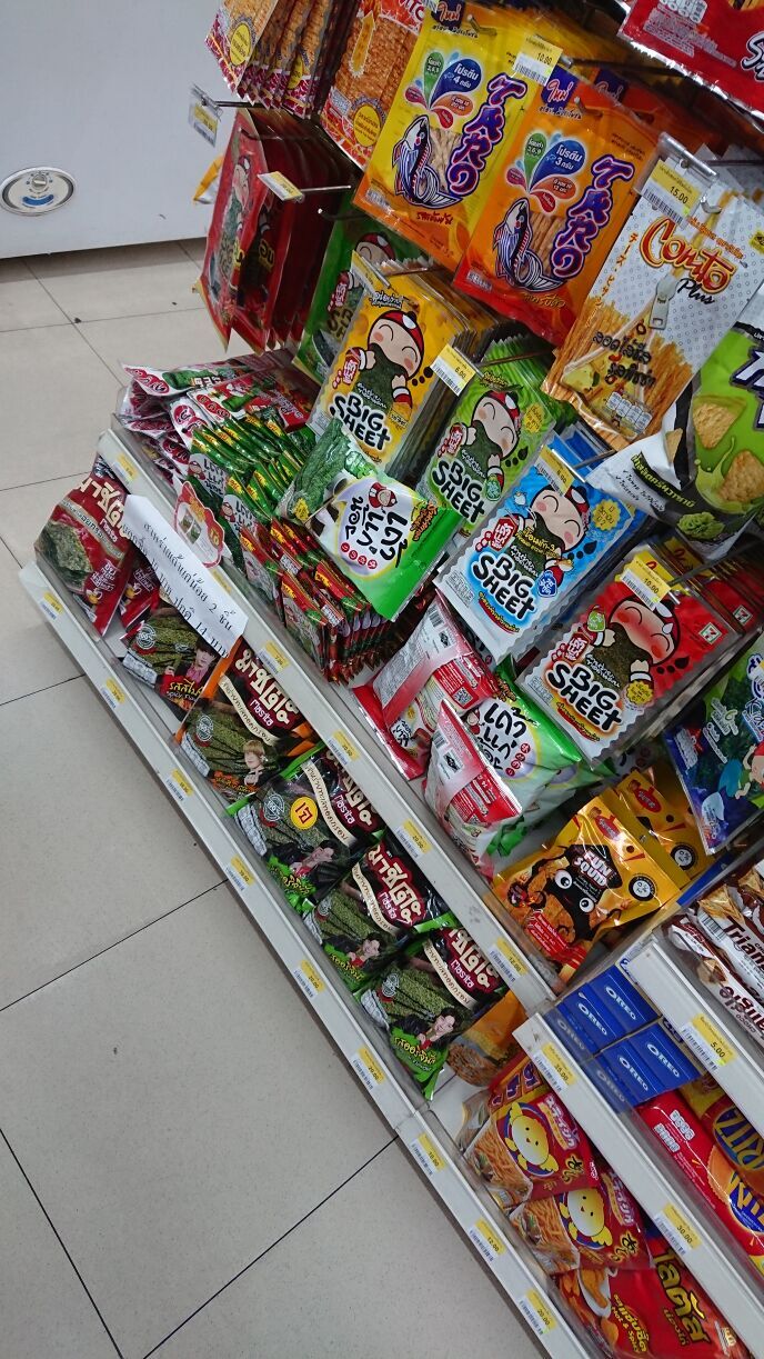 見ての通りバンコクのコンビニでは韓国海苔が大人気。まあバンコクだからタイ人に人気なのか、海外旅行者に人気なのかは分からないけどね。これはオレも食べてみたけどあんまり好きではないかな。やっぱりオレも日本人だからね、海苔がゴマ油でコッテリした感じなのイマイチかな。でもピリ辛韓国海苔は嫌いじゃない。