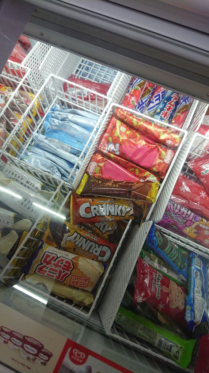 ほかにはやっぱりロッテがあるね。こっちはハングルで韓国系を押している感じなのかな?日本と同じ感じのクランキーチョコアイスで美味しい。