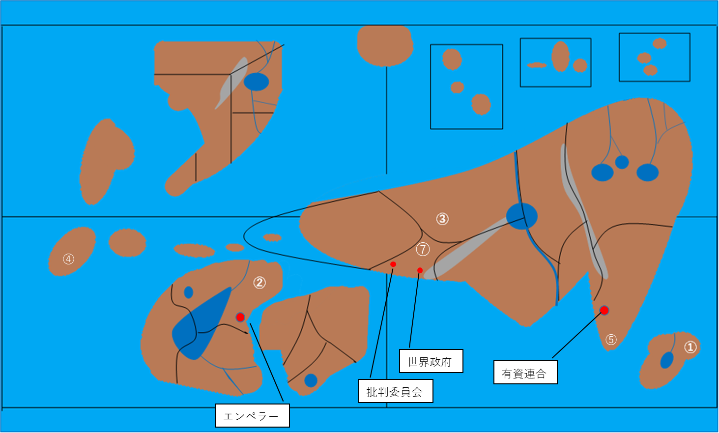 ⑦アナリア 100年前まで内乱を行っていた最後の国。内乱を収束に導いた人たちの呼びかけにより、「以降争いを起こさないため」世界政府が設立された。国としての機能はなく、この土地はすべて世界政府の管理下にある。