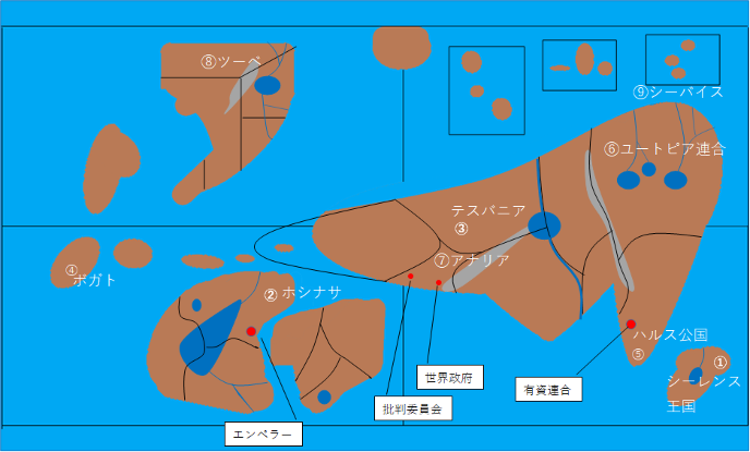 ⑨シーバイス ユートピア連合の北側にある無人島群。多様な水生生物の保護、観察のためユートピア連合が主要な管理を行っている。群島のうち1つをシーレンス王国が所有している。