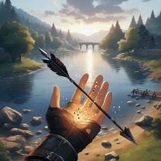 左斜め前に立ち動揺するリコの後方に移動し、番えている矢の先に左手を添えて目を閉じ、