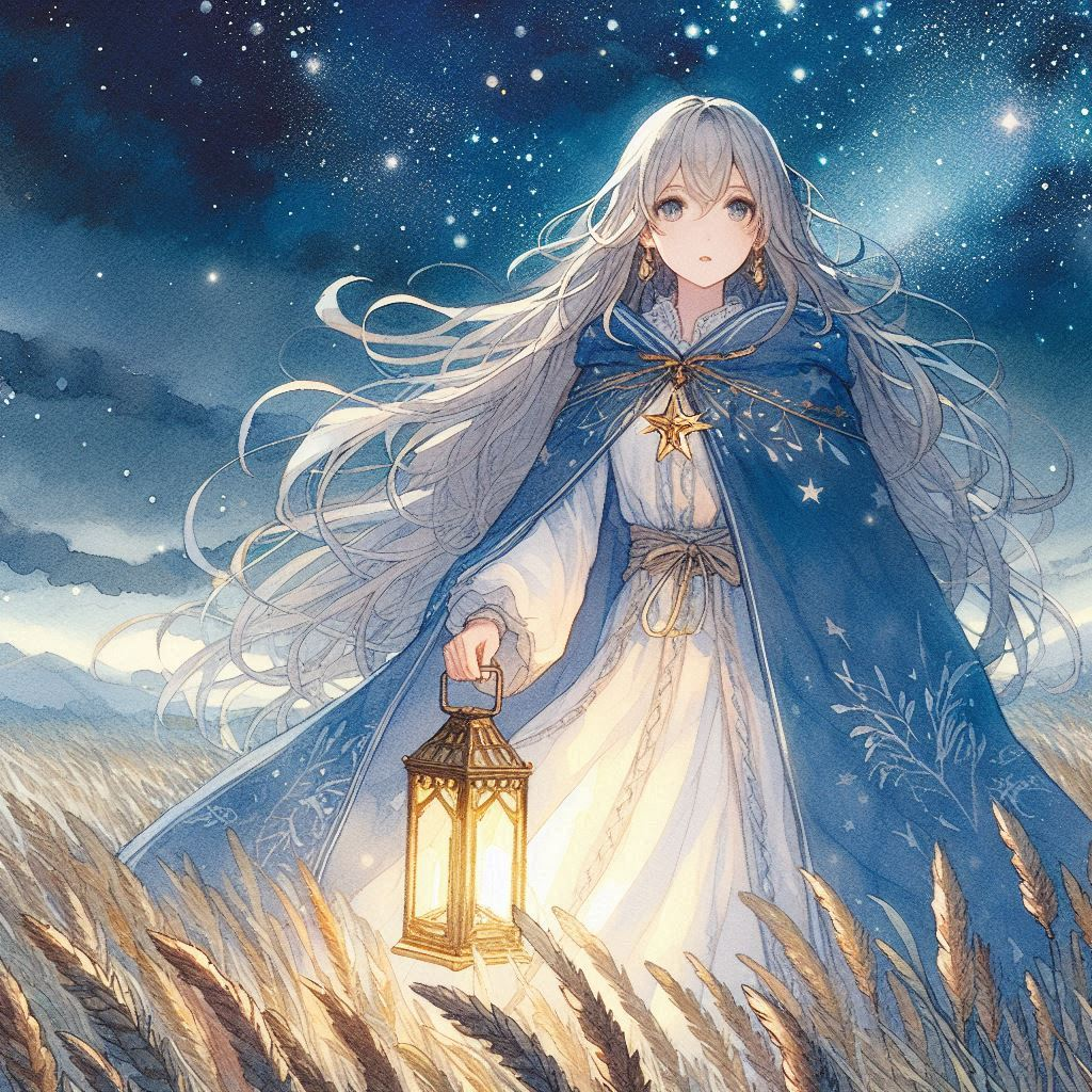 長い銀色の髪が夜風にそよぎ、星明かりを浴びてまるで天の川の一部のように輝いている。大きな瞳は深い青色で、まるで宇宙の神秘を秘めたかのように澄んでいた。彼女の纏った紺碧の外套は、草原の静寂に溶け込むように歩みに合わせて静かに揺れる。その外套の下にある白いドレスには星の模様が散りばめられており、一歩一歩進むごとに微かに光を放つ。