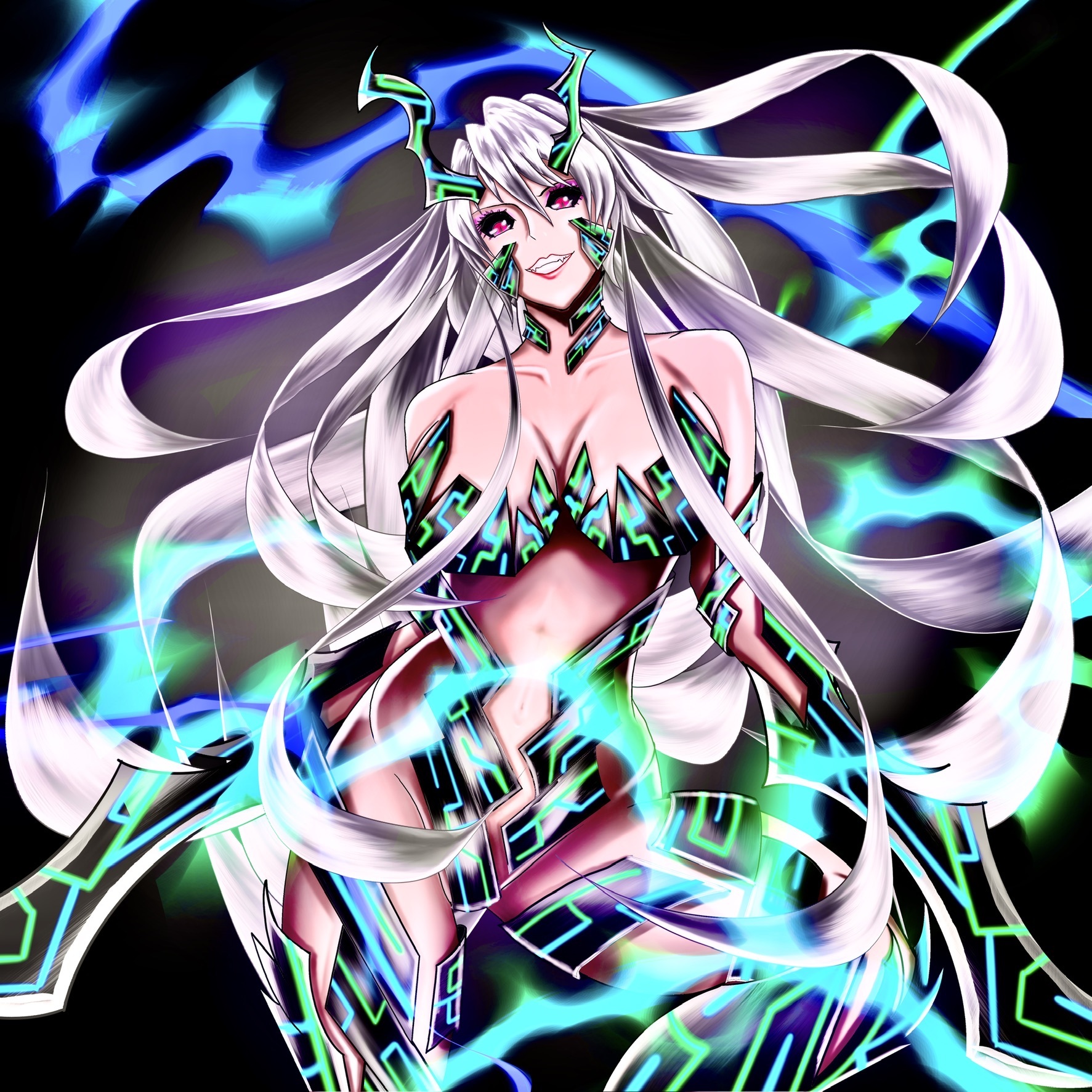 手は無くなり双剣と融合し、ライトグリーンだった目は赤く染まり、綺麗に武装された青緑の筋が流れるモノリスが体を補強するかのように配置され、尻尾までもが生えていた。