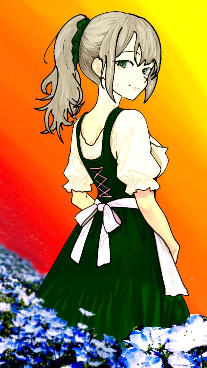 でも、ナイ嬢に比べたら若干お姉さんに(年上に)して欲しい、とは伝えました。酒場のおっさん達が思わず指を突っ込みたくなるような(お下品!)お胸もバッチグー(死語)ですb 足元の青い花はネモフィラで、たぶん体力回復草を表現してるんだと思います。遠くに行くほどぼやけるという加工をしているらしい(うろ覚え)
