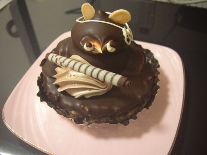 昔は生クリームがあまりもたなかったそうで(冷蔵技術の問題かと)、日持ちのするバタークリームのケーキが多かったのですね。平たく言うとバターに砂糖や卵を加えてホイップしたクリームです。たぬきの土台部分はスポンジケーキ、頭の部分は絞ったバタークリームに溶かしたチョコを掛けてから、目の部分をスプーンの柄の部分などでクリッとくりぬいて、白目と黒目をちょんっと付ける。