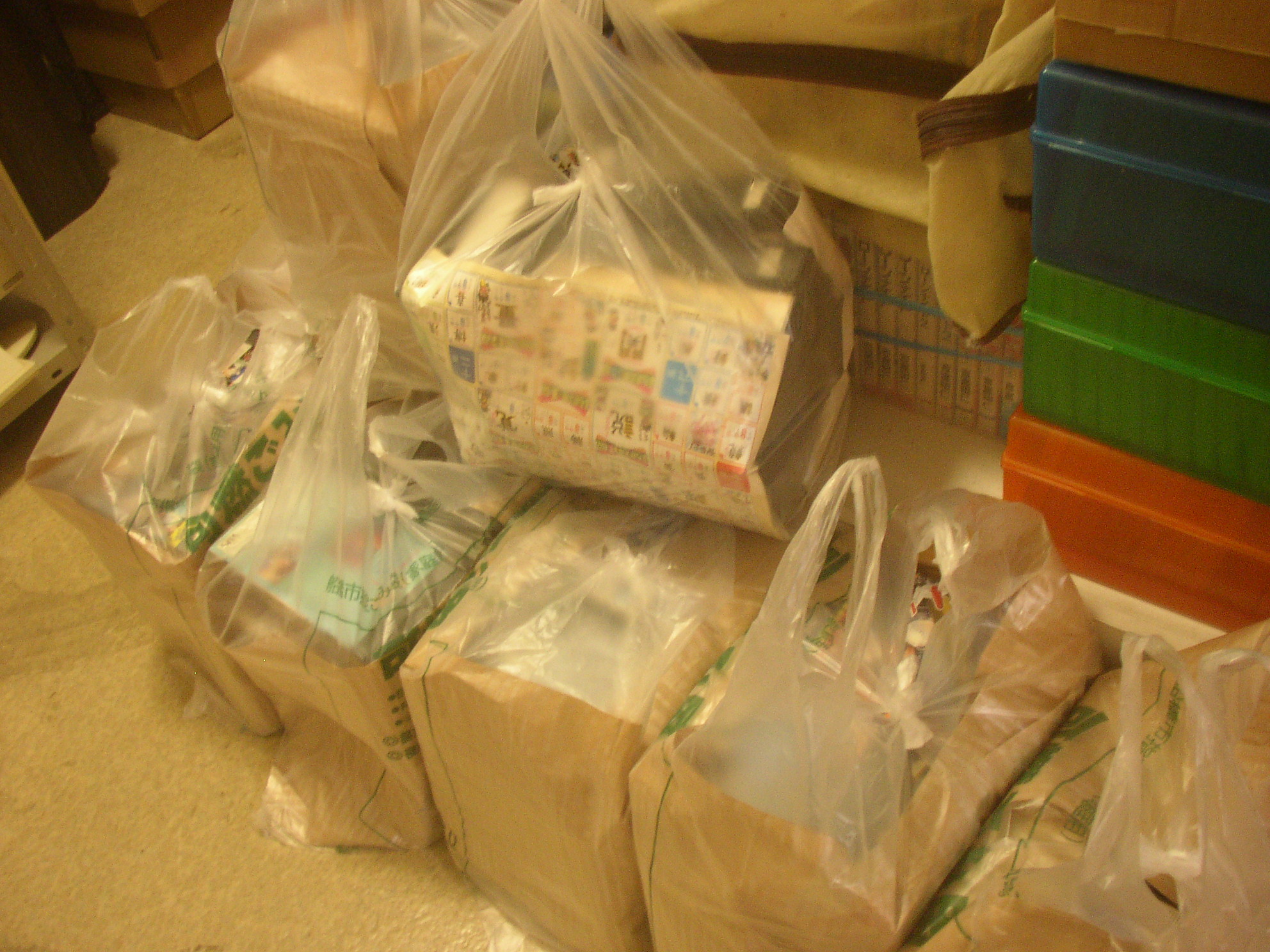 ちなみに、手前が私がまとめた捨てビデオ(背後にあるのが自室から溢れた漫画群)……30Lゴミ袋10袋ぐらいあります。すでに玄関に移動させた分もある。