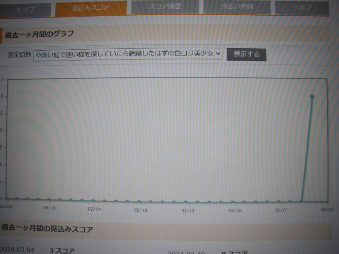 それはともかく、インセンティブ10倍のせいか、ユニークアクセス3で仮スコア3付いてますね。アルファポリス様、太っ腹ー(※これはつまり、本来のホラーカテではユニークアクセス10で仮スコア1の可能性が高い……ってコト!?(ちいかわ構文))