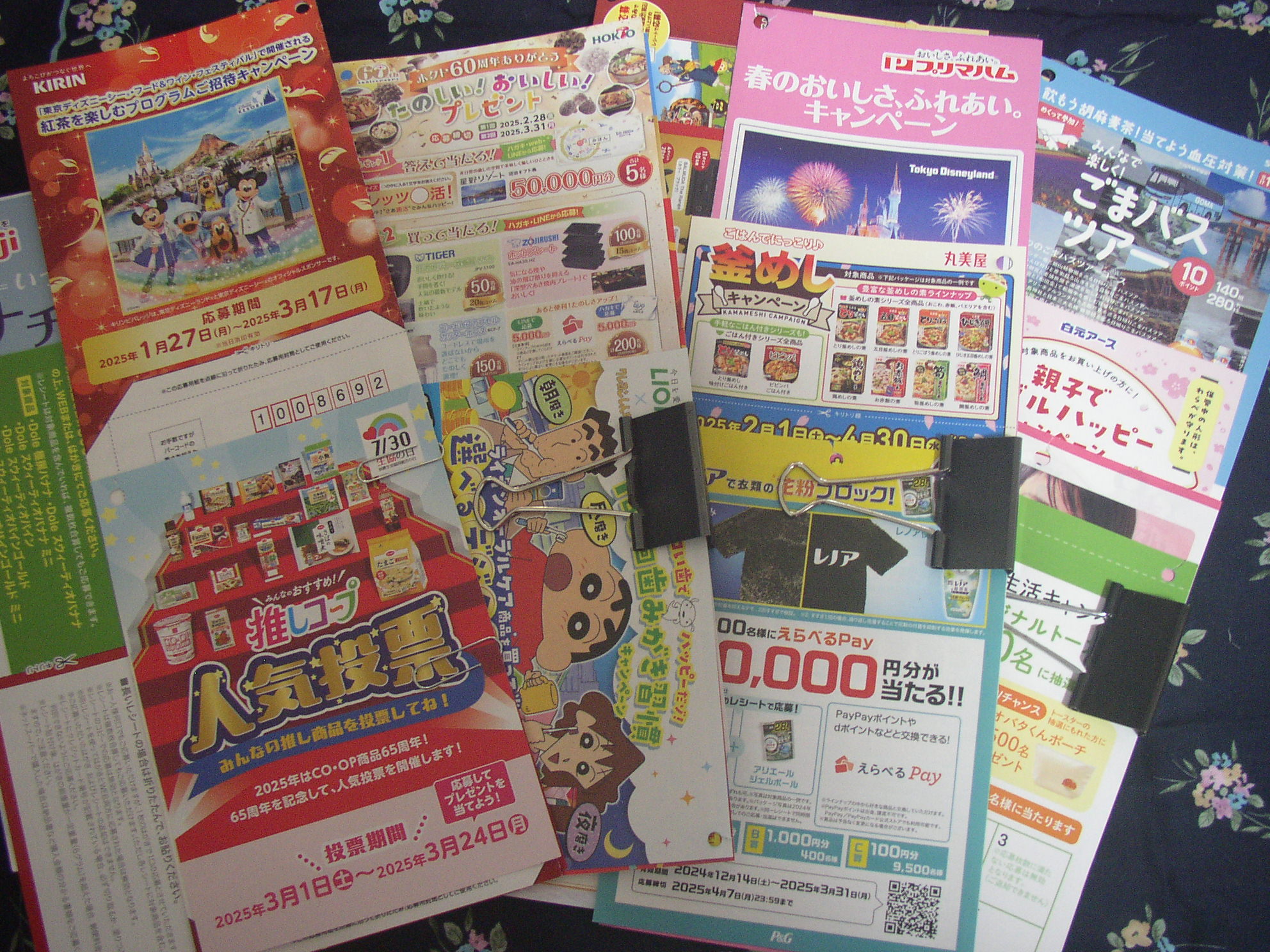 懸賞の総量が減った感じはしませんが、量販店に置かれている専用応募はがき等は数年前に比べて格段に少なくなりました。ネット応募への移行に伴い、キャンペーンの告知チラシが増えているように思われます。(-_-)旦~