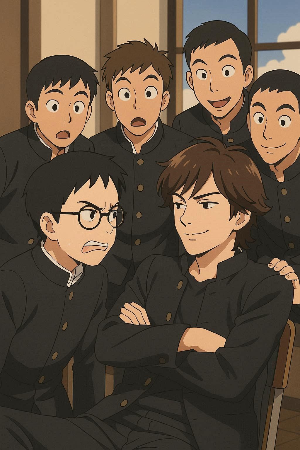 真面目だが強気で、どこか挑発的な笑みを浮かべる青年。