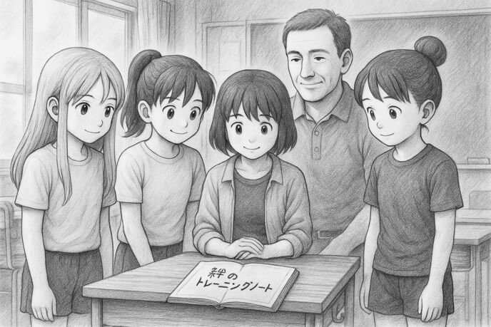 教室に残った先生と、4人の机に広げられた一冊のノート。