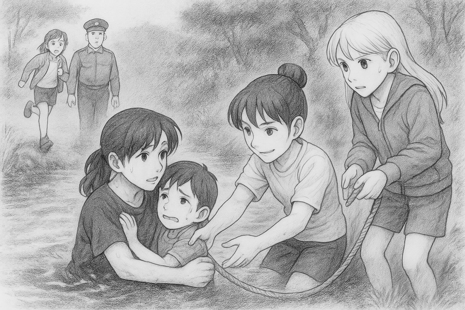 川のそばで、小さな男の子が水面で必死にもがいていた。そのそばで、もう一人の子どもが泣き叫んでいる。