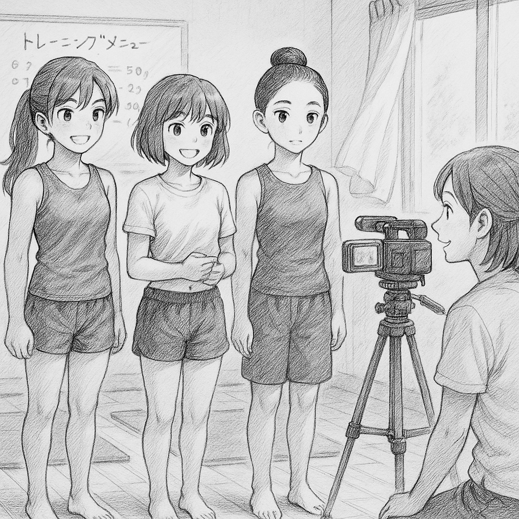 さちが笑いながらトレーニングメニューを読み上げたり、ハルが筋トレ中のフォームについて説明したり、ユキが記録表を見せたり――