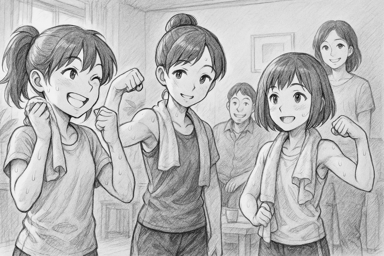 テレビの光がほのかに残る部屋の中で、3人の絆と身体はまた一歩、確かに前へと進んでいた。
