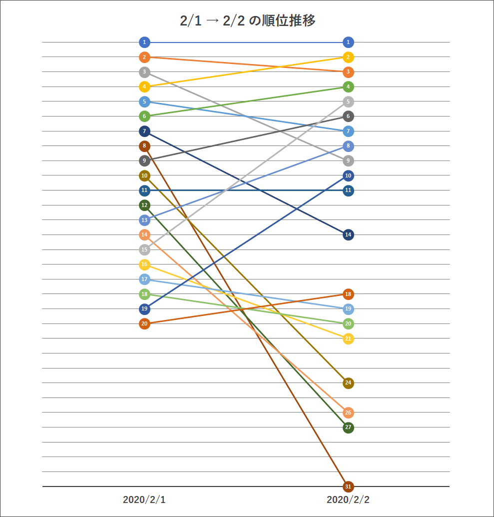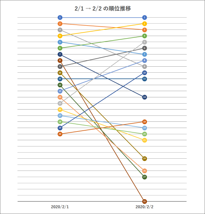 投票開始1日目(2/1)→2日目(2/2)の順位変動をグラフにしてみた