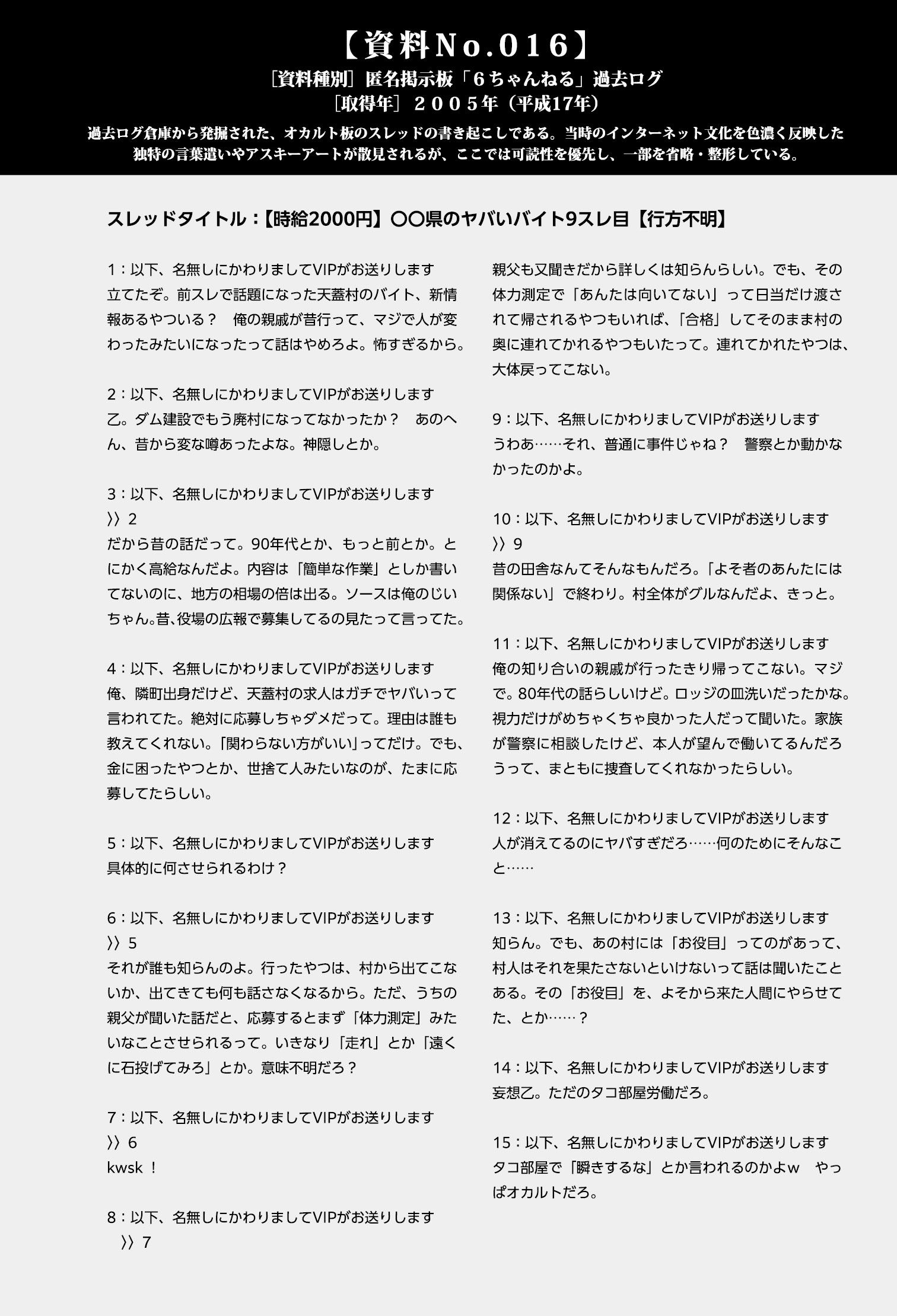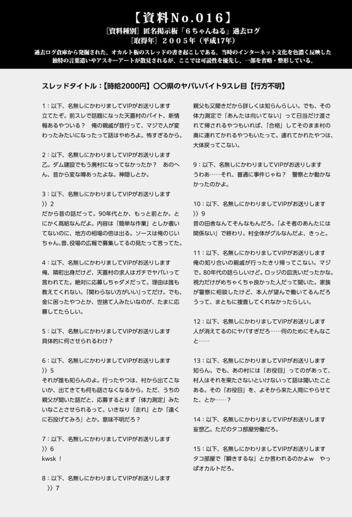 これまで集めてきた資料から一度離れ、ネットの深海に沈殿する、人々の「声」の断片を拾い集める作業へと移行した。初期段階では無視していた匿名掲示板のログを再検証した時、その書き込みがこれまでの資料と符合していることに気づいた。