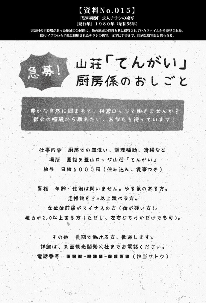 1973年にも、あの常軌を逸した「身体測定」のような求人を出していた、村営の観光ロッジだ。七年の時を経て再び同じ職種――厨房の皿洗い係を募集している。