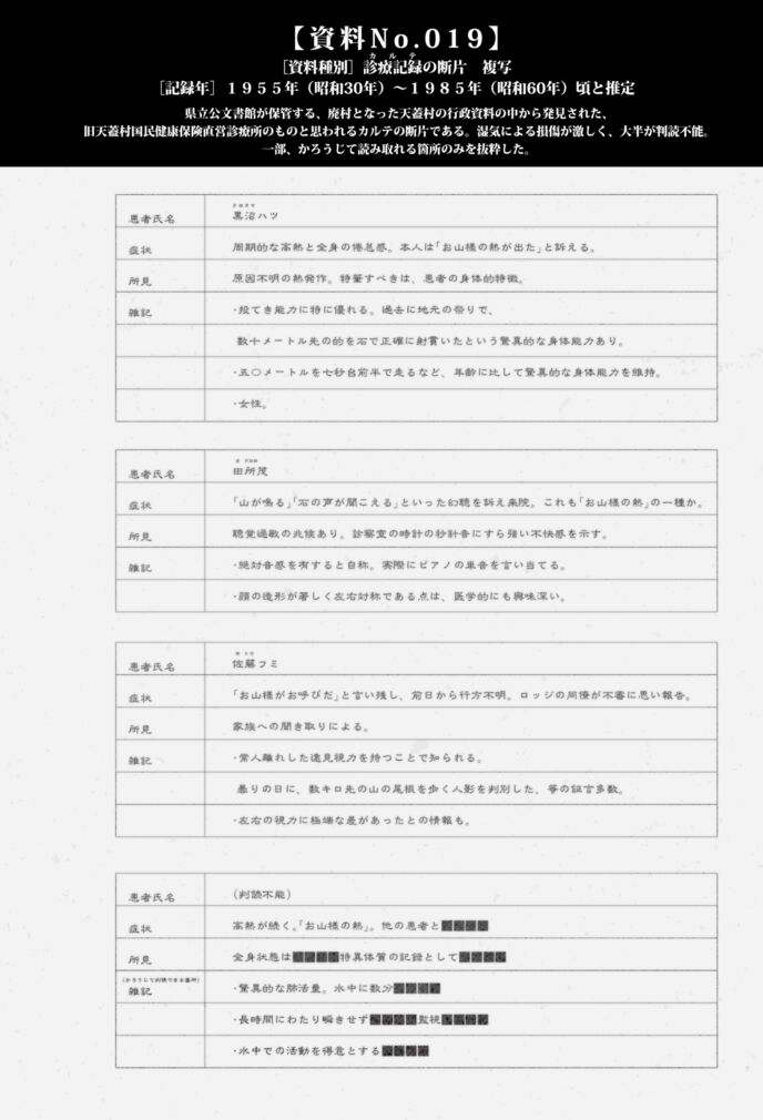 カルテには、「お山様の熱」という奇妙な病名が繰り返し登場する。周期的な高熱と、幻聴などの精神症状を伴う、原因不明の病。