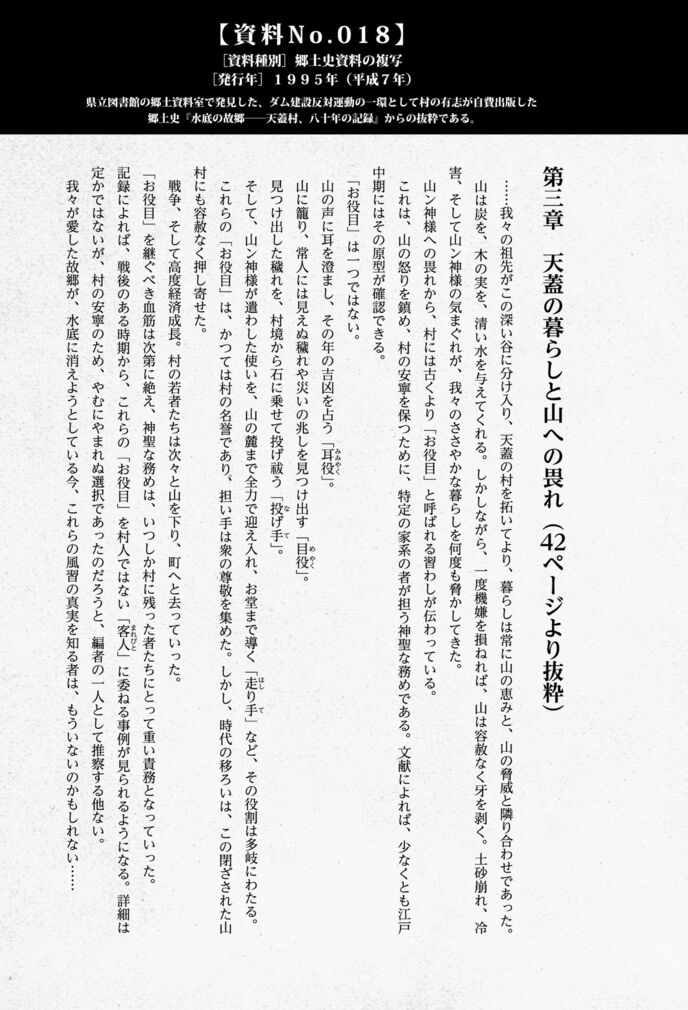 斉藤氏との面会で得た「お役目」というキーワードを頼りに、私は県立図書館の郷土資料室の奥深くへ分け入った。そして、ダム建設に反対する住民たちが遺した、1冊の自費出版本の中に、ついにその答えを発見したのである。