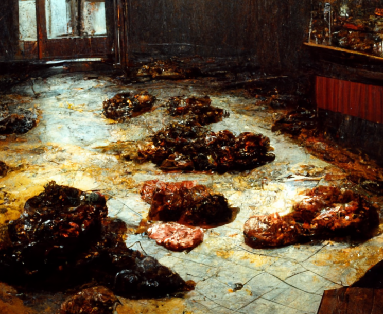 そこらかしこに散らばる死体。そのどれもがまともではなかった。体を小枝みたいに真っ二つに裂かれたもの。頭がひしゃげて胴体にめり込んでいるもの。不要になった紙でも絞ったかの様にねじられて死んでいるもの。人間の仕業ではない。血溜まりの中に村人だったであろう肉塊がゴロゴロ転がっている様子に部隊は恐れ慄いた。