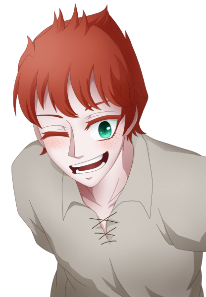 真面目だが強気で、どこか挑発的な笑みを浮かべる青年。