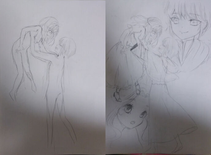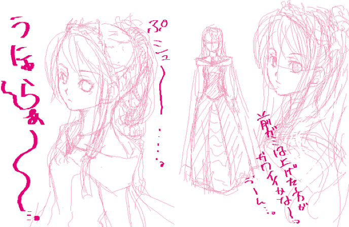 ラフの完成度がまだ高すぎる気がしたので、ボツになってもダメージが少ない段階でと言ってみたら、次の挿絵のラフはこれでした。