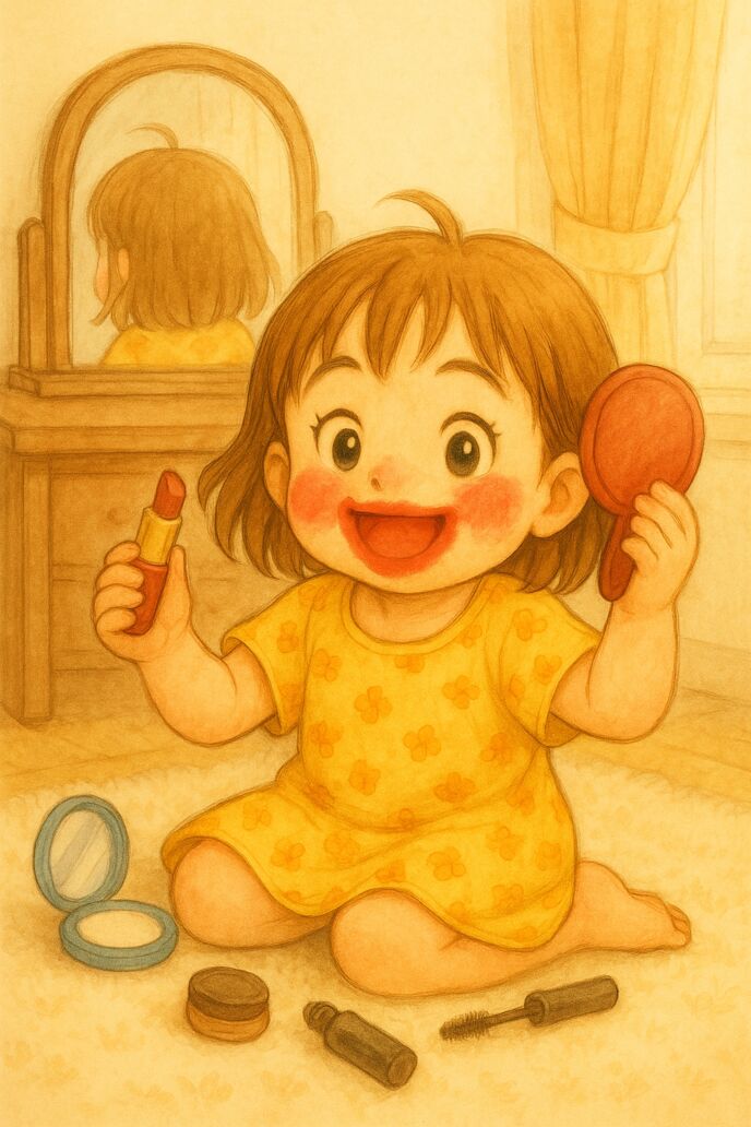 鏡の中ののんちゃんは、もう“かわいい”を超えて、“どこかの妖精かおばけ”みたい。