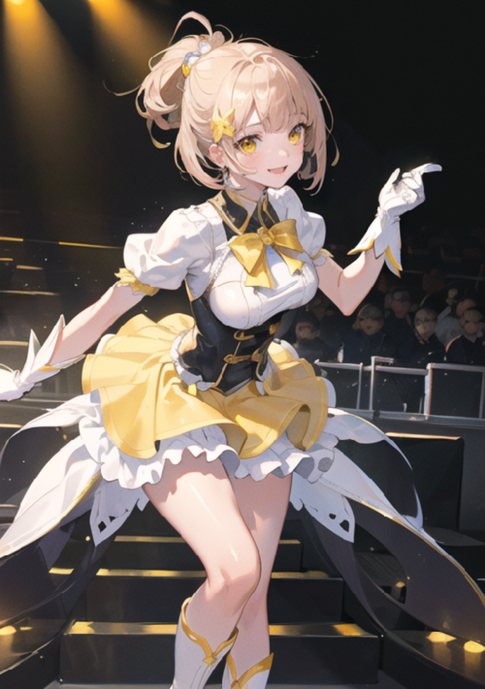 眩しい黄金色の魔法少女コスチュームに身を包み、一段高いステージのようなところに立って軽快なダンスと共に唄っている。