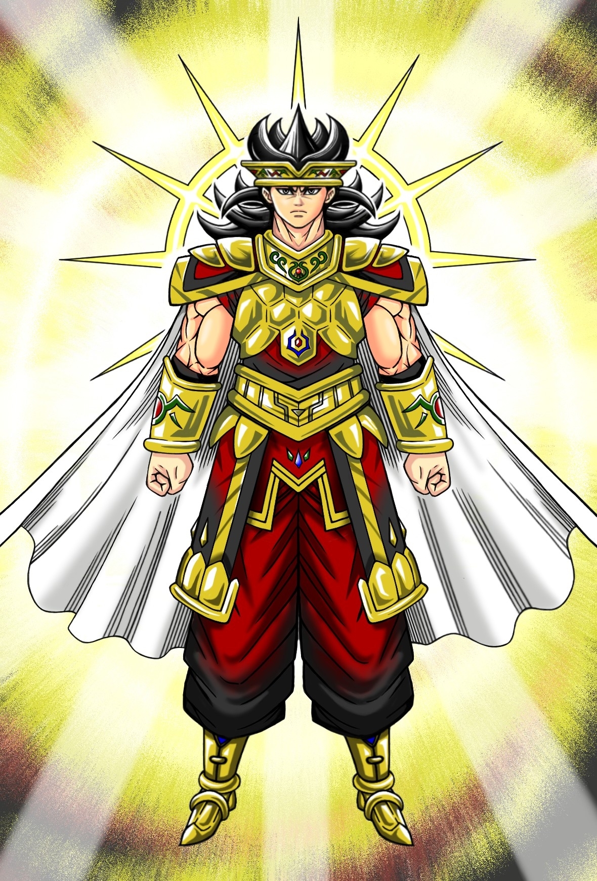 額に帯びた冠、真紅の衣装、純白のマント、黄金の鎧と靴を身に纏う。