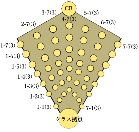 『クラス拠点』から見て、左端の外周線を1列目、右端の外周線を7列目と数え、手前を1段目、奥を7段目と数える。