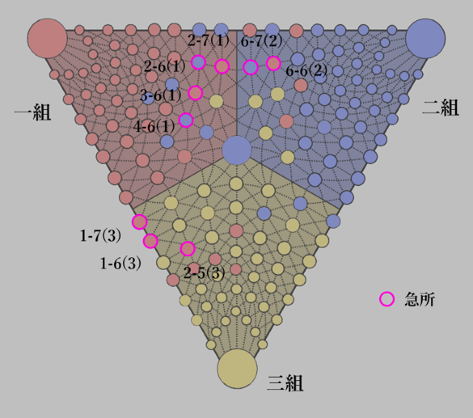 一組・二組の抱える『急所』は2-6(1), 2-7(1),2-6(1),4-6(1),6-6(2),6-7(2),1-6(3),1-7(3),2-5(3)……この辺りの『拠点』を一つ二つ落とせれば、ほぼ確実に逆転できる。