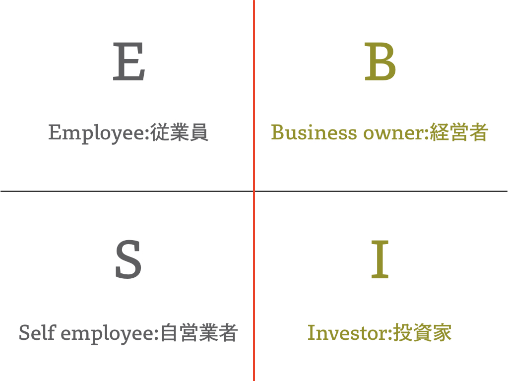 と驚かれた。ESBIクワドラントとは、従業員をE、自営業者をS、経営者をB、投資家をIとして一枚にまとめた図である。