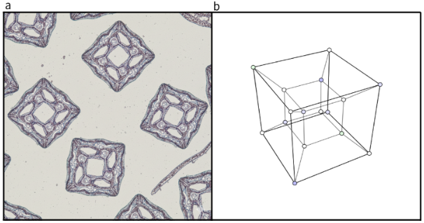 Fig.5 a.触角断面の顕微鏡画像 b.正八胞体(4次元超立方体の2次元投影図)