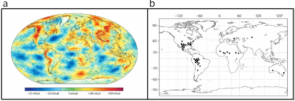 Fig.6 a.地球の重力分布 b.主なフツウゾウムシの生息分布