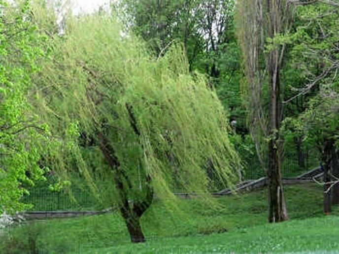 太い柳の木が何本もあるところに現れ、