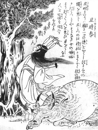 鳥山石燕や葛飾北斎の版画には、呪術する女性のかたわらに黒牛(こくぎゅう)が描かれ、