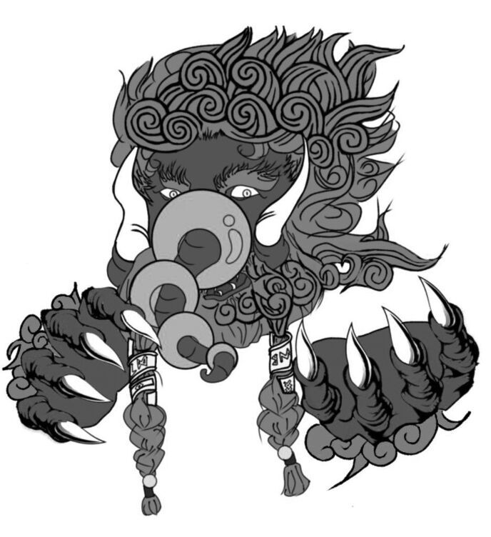 その顎髭の下には、呪文が刻まれた黄銅の髪留めで結ばった、長い口髭が乱雑に編まれた二本の三つ編みが垂れ下がっており。口髭を撫でる無骨な指からは非常に長い鉤爪が伸びていて。